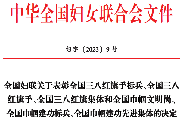 近日,中华全国妇女联合会印发《全国妇联关于表彰全国三八红旗手标兵、全国三八红旗手、全国三八红旗集体和全国巾帼文明岗、全国巾帼建功标兵、全国巾帼建功先进集体的决定》(妇字〔2023〕9号),星空官网控股集团办公室行政部上榜,获评“全国巾帼文明岗”。